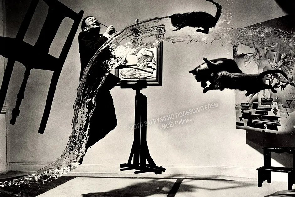 "...Сальвадор Дали рано понял, что фотография – неисчерпаемый источник вдохновения и саморекламы. Но только совместно с Филиппом Халсманом ему удалось реализовать необычные эксперименты. Фотограф не просто запечатлел художника. Общими усилиями они создали шедевры фотоискусства, о которых говорят до сих пор. Художник и фотограф будут общаться на протяжении 37 лет. Это сотрудничество станет судьбоносным для обоих: Халсмана назовут родоначальником сюрреализма в фотографии. Дали утвердит в глазах американцев свою репутацию эксцентричного гения. Филипп Халсман и Сальвадор Дали познакомились в 1941 году, приехав в Америку с разницей три месяца. Это время стало важным этапом в жизни обоих... В 1948 году им пришла в голову занимательная идея, результатом которой стал бесспорный шедевр, который вошел в историю под названием Dali Atomicus. Сейчас эта работа изумляет тем, что была создана без использования монтажа и последующей обработки. Современников Халсмана фото занимало сложным толкованием. Дали увлекся ядерной физикой, начав изучать структуру атома. Его интересовала теория Резерфорда-Бора, исходя из которой атом был подобен микроскопической Солнечной системе. Вокруг заряженного ядра движутся противоположно заряженные электроны. Физики также высказали гипотезу, что вся материя находится в подвешенном состоянии временной остановки. Халсман предложил Дали оригинальную идею: сделать снимок с необычной динамикой и композицией. Фотограф хотел использовать молоко, но в послевоенные годы это могло бы показаться излишней расточительностью. Котов следовало просто подбрасывать и взрывать (какие физические процессы символизировал взрыв – история умалчивает). Потом от «напрасного перерасхода» котов решили всё-таки отказаться. Фотограф представил, сколько животных придется принести в жертву во имя искусства (и сколько крови надо будет отмыть в процессе съемки). На леске были подвешены предметы интерьера. На счет «три» из левого угла помощники подбрасывали котов, из правого - выливали воду. В следующее мгновение подпрыгивал Дали. Жена Халсмана Ивонна держала стул. Через несколько дублей фотограф шел проявлять плёнку, ассистенты вытирали воду и сушили котов. Халсман, чтобы добиться реалистичности, использовал очень сильное освещение. Только 28-й кадр получился удачным, к облегчению уставшего Дали (и к немалой радости ассистентов и ошалевших котов). Dali Atomicus имеет прямую ссылку на картину Дали «Атомная Леда», которая находится в левом углу..." http://buy-books.ru/blog/filipp-khalsman-salvador-dali.html