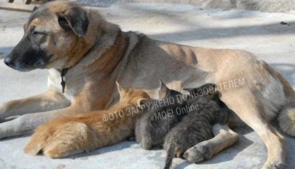 Добродушная дворняжка Бляха прибилась к пожарной части №29 в Горловке несколько лет назад. Каждый день добросовестно провожала и встречала своих новых хозяев на выезды, а по два раза в год приносила симпатичных щенков. Кстати, потомство Бляхи быстро разбирали: в частном секторе щенки от такой приличной собаки, воспитанной пожарными, были нарасхват!!! А недавно Бляха и вовсе стала местной героиней. Как-то утром собака отправилась за компанию с пожарными на остановку, а там заинтересовалась чёрным пакетом, стоявшим у лавочки. В нём оказались семь новорожденных котят. Собака перетащила котят к себе в будку и начала выхаживать!!! У Бляхи недавно родились свои щенки, которых уже успели разобрать, а молоко ещё осталось. Как ни странно, собачье молоко пришлось котятам по вкусу, и все семь пушистиков выжили. Теоретически для котят и для самой собаки это не опасно. Но странно - это уж точно :)