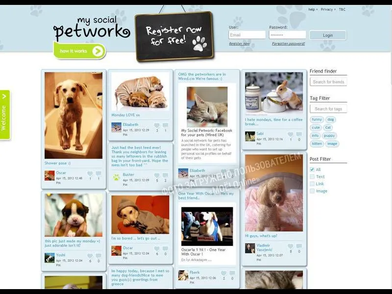 "...Миллиарды людей по всему миру имеют профили в соцсетях. Некоторые считают, что пришло время завести аккаунты и для домашних любимцев. В Великобритании запущена первая социальная сеть, призванная объединить животных и их хозяев со всего мира. Необычный сайт My Social Petwork позволяет зарегистрировать два аккаунта – один для питомцев и один для их хозяина. В профилях размещаются фотографии и видеозаписи кошек, собак, попугайчиков и прочих домашних животных. Администрация ресурса постоянно мониторит фотографии, самые лучшие из них выносятся на главную страницу ресурса передает TheTelegraph. Дизайн "зверьбука" напоминает Pinterest, упор делается на визуальный контент. Благотворительные организации собираются использовать сайт, чтобы найти хозяев для обездоленных животных. Рекламодатели также заинтересованы в сервисе, так как он предоставит возможность размещать рекламу, таргетированную на владельцев животных. В настоящий момент в Великобритании насчитывается около 16 миллионов кошек и собак. Статистика утверждает, что каждый десятый хозяин животного загружает в сеть фотографии питомца не реже раза в неделю. Таким образом, My Social Petwork имеет большой потенциал для развития..." http://hitech.vesti.ru/news/view/id/1769