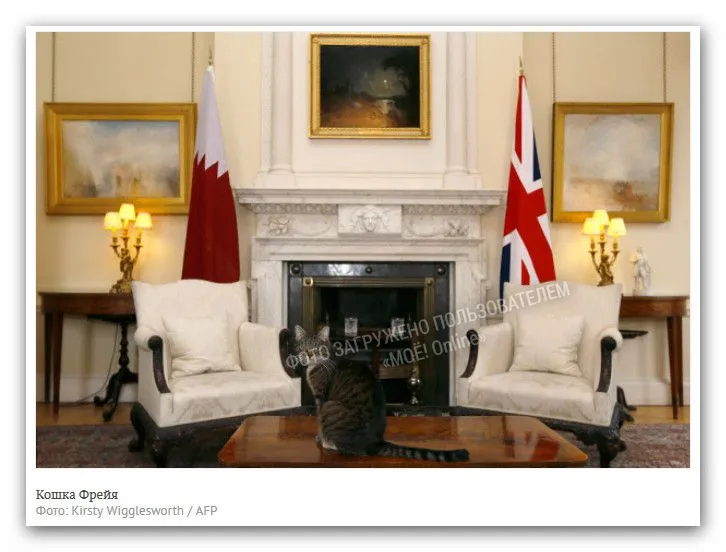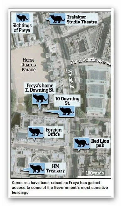 "...Фрейю, кошку канцлера британского Казначейства Джорджа Осборна, заподозрили в шпионаже. Такое мнение, как пишет The Daily Mail, высказали представители правительственного квартала Лондона, которые наблюдают за похождениями любимицы министра финансов. Кошка навлекла на себя подозрения в связи с несколькими фактами. Первым странным моментом в ее биографии названо загадочное исчезновение: семья Осборнов завела Фрейю в 2009 году (тогда Консервативная партия, которую представляет министр, была в оппозиции, и его семья жила в Ноттинг-Хилле, а не на Даунинг-стрит, как сейчас), через несколько месяцев она пропала, но в 2011 году нашлась. Ее идентифицировали по чипу и вернули Осборнам, к тому времени уже поселившихся в министерской резиденции на Даунинг-стрит, 11. По мнению критиков, за то время, что Фрейя отсутствовала, ее могли «завербовать» китайские шпионы, которые снабдили ее секретным оборудованием, а затем вернули хозяевам. Вторым необычным эпизодом жизни кошки названо ее поведение. Так, в отличие от кота премьер-министра Дэвида Кэмерона, Ларри, который предпочитает бездельничать, Фрейя разгуливает по Уайтхоллу, бывает на военных учениях, посещает разные правительственные здания и даже проводит время в баре. Бар находится на приличном расстоянии от Даунинг-стрит, 11, и сотрудники заведения по вечерам провожают ее домой. Комментируя свободное посещение Фрейей разных охраняемых зданий, секретарь Джорджа Осборна заявил, что «она из Казначейства, ей можно везде». Как сам министр финансов Великобритании относится к подозрениям относительно деятельности его кошки, неизвестно. Официально Фрейя вместе с Ларри занимается ловлей мышей и крыс у резиденции премьер-министра. Ее взяли в помощь Ларри, так как тот был замечен в лености и ненадлежащем исполнении своих обязанностей. http://lenta.ru/news/2013/06/10/freya/ http://www.dailymail.co.uk/news/article-2338481/The-purr-fect-spy-After-Freya-cats-mysterious-vanishing-act-No10-insiders-asking-Osbornes-roving-tabby-returned-Chinese-agent.html?ico=home^editors_choice Кошка Фрея, как только поселилась в министерской резиденции, подралась с бывшим главным крысоловом, котом Ларри и одной левой побила его, что тоже подозрительно. Фото: 1.кошка Фрея 2. кот Ларри 3. Места прогулок Фреи. 4.удар Фреи