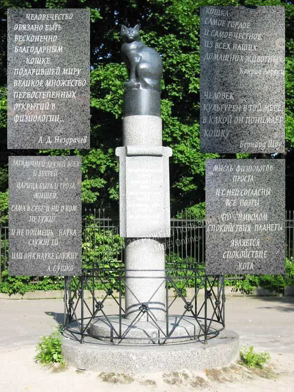 "Человечество должно быть бесконечно благодарным кошке, подарившей миру великое множество первостепенных открытий в физиологии" А.Д.Ноздрачев Идея устанвоить памятник кошке принадлежит академику РАН Александру Ноздрачеву. Постамент украшен изречениями известных ученых и писателей о кошках. "...Памятник находится в Санкт-Петербурге по адресу Университетская наб., 9. Скульптор А.Г. Дёма, архитекторы С.Л. Михайлов, Н.Н. Соколов. Установлен во дворе главного здания Петербургского государственного университета. Открыт 14 ноября 2002 г. Материал: габбро, гранит. Высота фигуры 107 см, высота постамента 200 см. Идея создания памятника принадлежит академику РАН Александру Ноздрачеву. Ее поддержали Санкт-Петербургский государственный университет, Институт физиологии имени Ивана Павлова РАН, Институт эволюционной физиологии и биохимии имени Ильи Сеченова РАН, института Мозга человека РАН и Санкт-Петербургский клуб любителей кошек «Фелис»..." http://www.kotsobaka.ru/news/cats/145549/